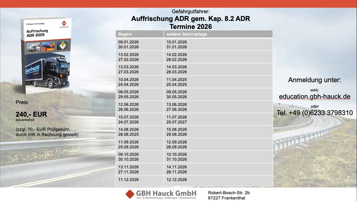Die Inhalte richten sich nach Kap. 8.2 ADR und den Vorgaben der IHK. Es werden grundlegende Lehrinhalte und Neuerungen vermittelt.