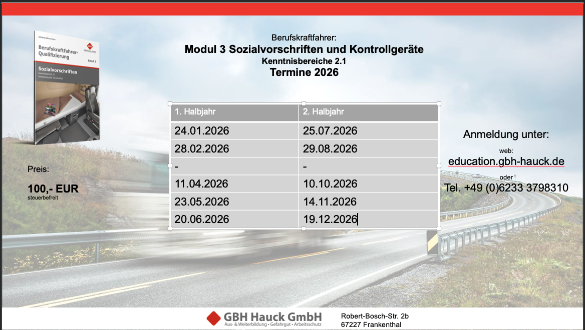 Gemäß Richtlinie 2003/59/EG, Berufskraftfahrer-Qualifikationsgesetz (BKrFQG) und Berufskraftfahrer-Qualifikations-Verordnung (BKrfQV) i.V.m. EU 2018/645.