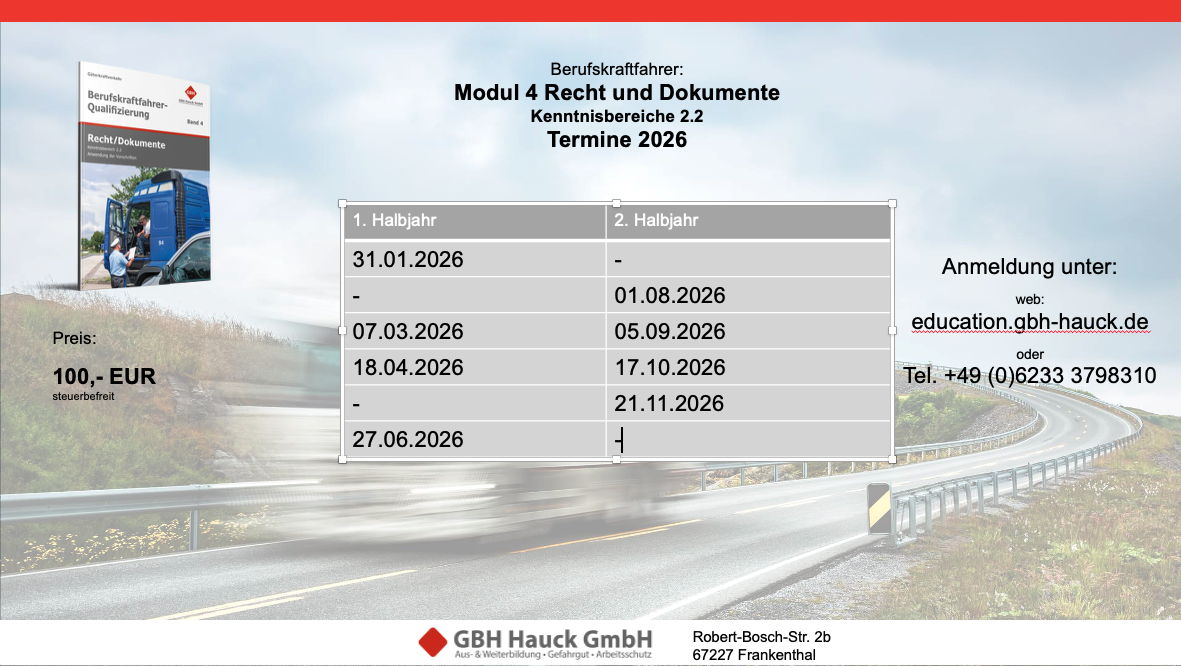 Gemäß Richtlinie 2003/59/EG, Berufskraftfahrer-Qualifikationsgesetz (BKrFQG) und Berufskraftfahrer-Qualifikations-Verordnung (BKrfQV) i.V.m. EU 2018/645.