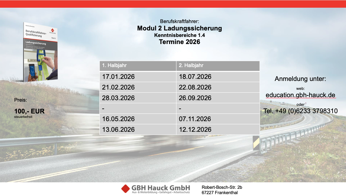 Fähigkeit zur Gewährleistung der Sicherheit der Ladung unter Anwendung der Sicherheitsvorschriften und durch richtige Benutzung des Kraftfahrzeugs, insbesondere: bei der Fahrt auf das Kraftfahrzeug wirkende Kräfte, Einsatz der Getriebeübersetzung entsprechend der Belastung des Kraftfahrzeugs und der Fahrbahnprofil, Berechnung der Nutzlast eines Kraftfahrzeugs oder einer Fahrzeugkombination, Berechnung des Nutzvolumens, Verteilung der Ladung, Auswirkungen der Überladung auf die Achse, Fahrzeugstabilität und Schwerpunkt, Arten von Verpackungen und Lastträgern, Kenntnisse über die wichtigsten Kategorien von Gütern, bei denen eine Ladungssicherung erforderlich ist, Feststell- und Verzurrtechniken, Verwendung der Zurrgurte, Überprüfung der Haltevorrichtungen, Einsatz des Umschlaggeräts, Abdecken mit einer Plane und Entfernen der Plane.
